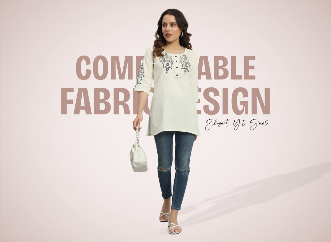 Elegant White Embroidered Kurti with Three-Quarter Sleeves