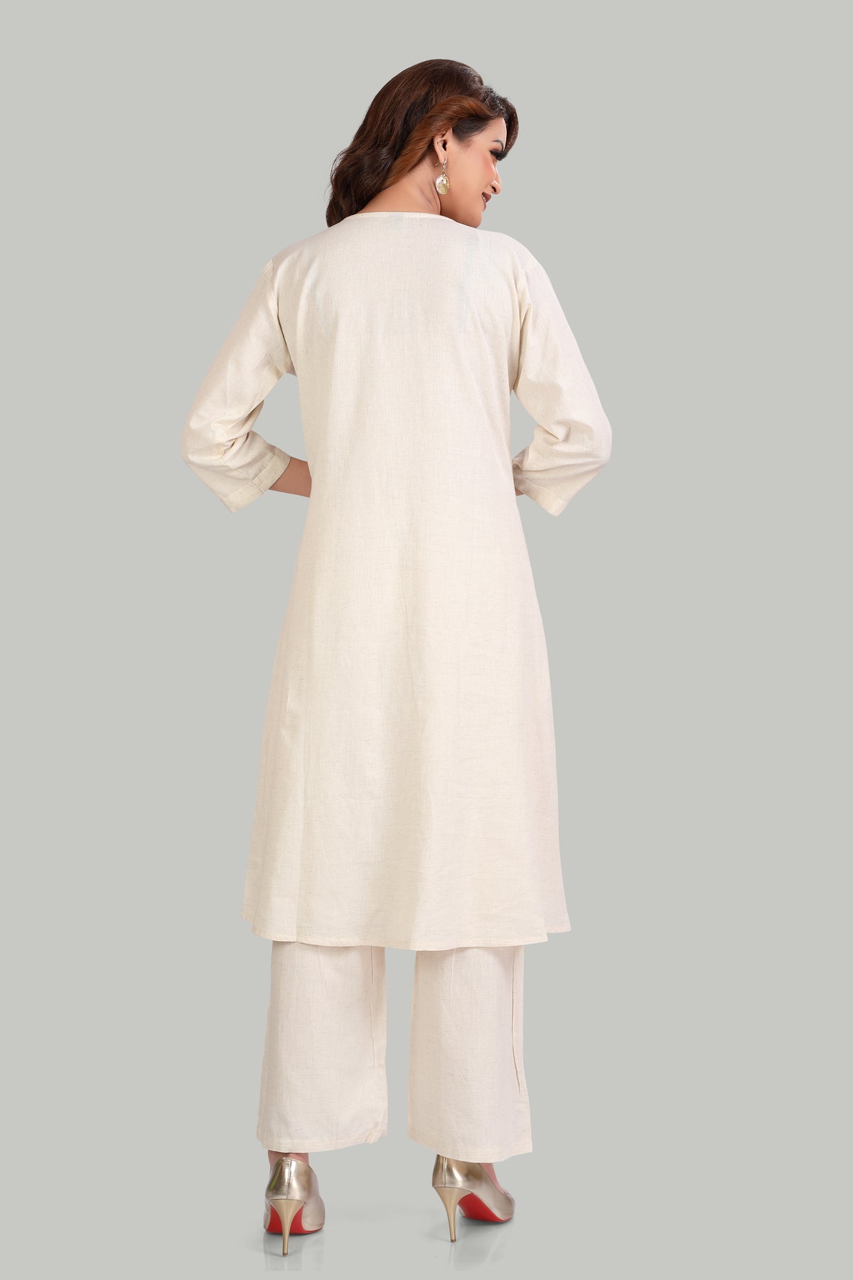 The three-quarter sleeves and button-down style add a modern touch to classic ethnic wear, while the wide-legged palazzo pants offer comfort and sophistication.